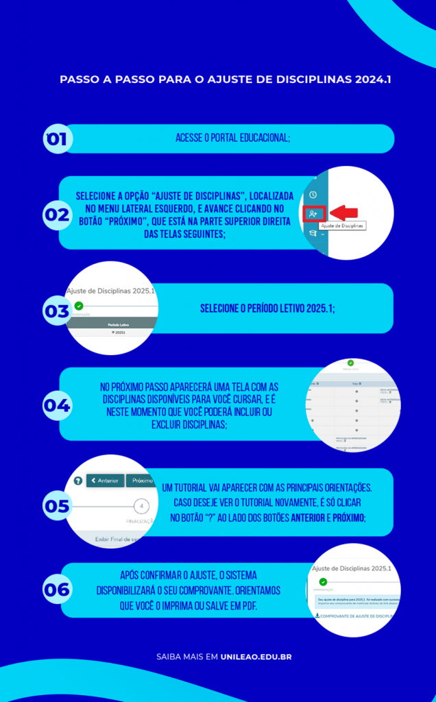 Começa a partir das 14h desta quinta-feira (23), o prazo para o ajuste de disciplinas on-line 2025.1, do Centro Universitário Doutor Leão Sampaio (Unileão). O processo é simples, rápido e pode ser feito de forma totalmente on-line pelo Portal Educacional. Para realizar o ajuste de disciplinas, os estudantes precisam ter renovado suas matrículas para o semestre 2025.1.