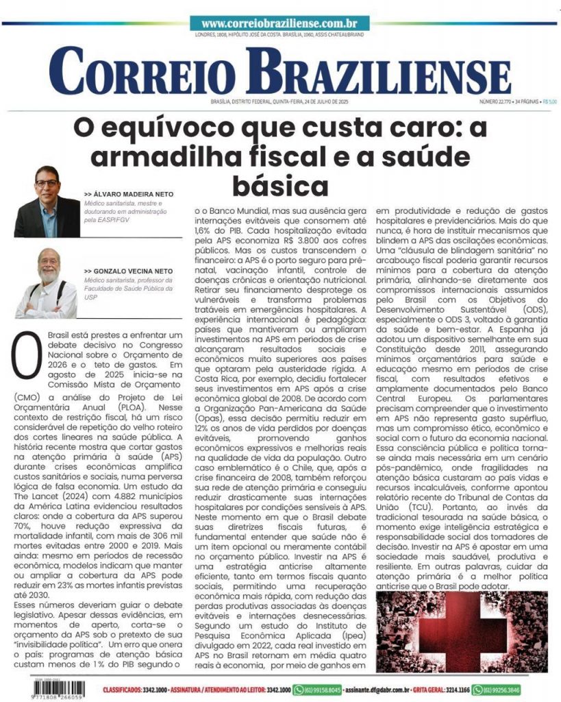 Intitulado “O equívoco que custa caro: a armadilha fiscal e a saúde básica”, o texto analisa como decisões fiscais equivocadas — especialmente o desinvestimento na Atenção Primária à Saúde — podem gerar impactos negativos e altos custos, tanto para a qualidade de vida da população quanto para a economia do país.